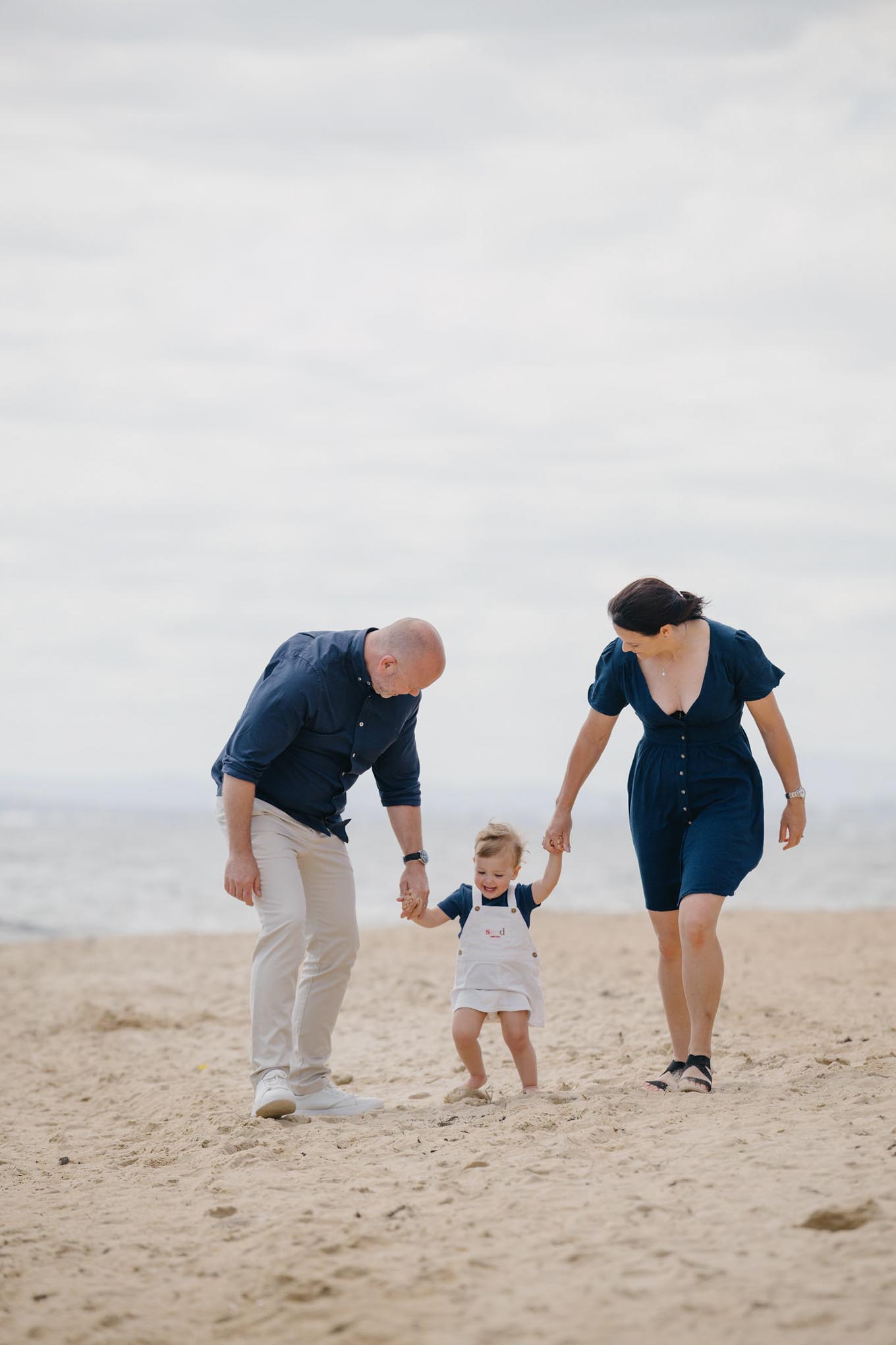 For family sessions, this approach is especially effective. In a recent beach family shoot, mum, dad and their two-year-old daughter wore a mix of navy and cream — different pieces, same tones. The result felt connected, relaxed and beautifully balanced.